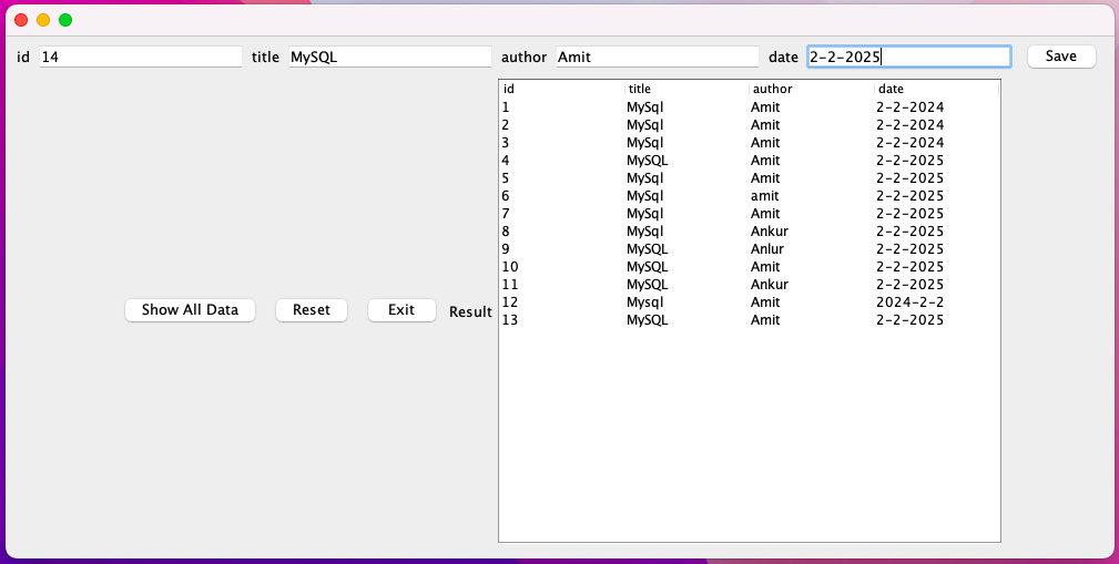 insert into jdbcTable values (2,"MySql","Sumit","2-2-2024");